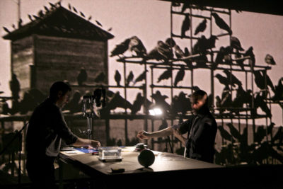 Birdie es un espectáculo con objetos, vídeo en directo, maquetas, dos mil animales en miniatura, guerras, traficantes de personas, una migración masiva, imágenes revisitadas de Los pájaros de Hitchcock, y tres performers manejando este mundo embrollado con humor, sentido crítico y compromiso con el ser humano.