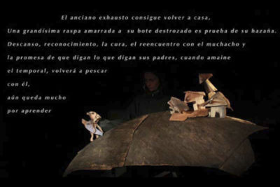 El mar es la naturaleza más salvaje, la más inesperada y menos controlable. Tiene tesoros y criaturas que escapan a nuestro conocimiento. Una mano anciana sabe cómo echarle un pulso, una aventura en la que todo se puede torcer o en la que te puede ser otorgado el sustento diario. Una mano anciana y un pez espada. El sedal sujeta y retiene. Es la preciosa danza de la superación y la libertad. Danza de respeto infinito a la naturaleza que siempre vence. Este viejo ya ha bailado tantas veces… sabe bailar. Pero este pez es demasiado grande. La mano anciana sujeta sin querer hacer daño a su presa, con la fuerza justa en cada momento, sabe que es enorme y si se espanta o enfada saldrá a superficie y la batalla estará perdida. Como metáfora de la vida, él no va a rendirse, cada paso en la lucha es una lección maestra de experiencia y respeto a sus contrincantes.