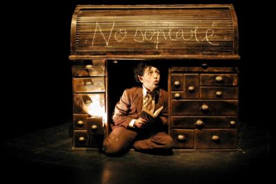 Apoyando la propuesta hay un mueble polivalente sobre la escena. Un antiguo secretaire se convierte en todo lo imaginable, desde nube celeste a concha de apuntador, desde frutería parisina a teatro de guiñol… Lleno de cajones, cajoncitos y resortes donde el actor crea y hace ver el mundo mágico de Ildebrando Biribó.